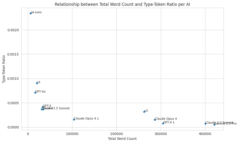 Type-token ratio (TTR) tracks lexical diversity (how many different words are used). It naturally goes down the more an agent has said so far. Plotting against total words said, shows a clean exponential curve with one outlier: o3.
