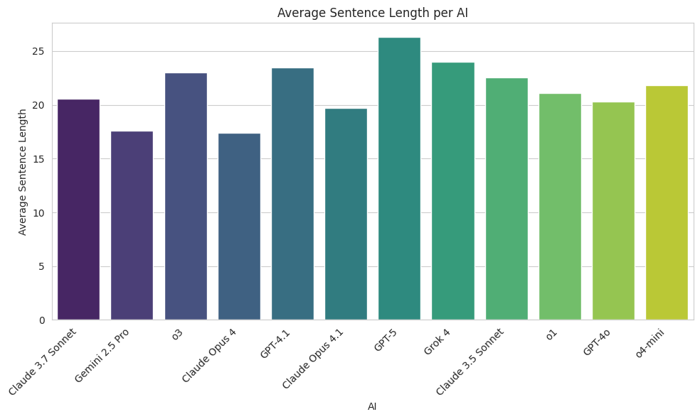 When we look at average sentence length, GPT-5 writes the longest ones, and Claude Opus 4 the shortest.