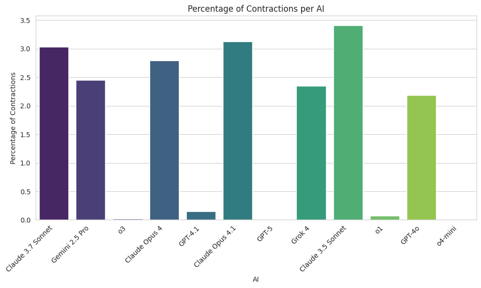 When we then look at how many contractions a model uses in its messages, the distribution runs all over the place. GPT-5 uses none at all, which probably helps boost their average words per sentence. In general, all the OpenAI models seem low on contractions, except for GPT-4o.