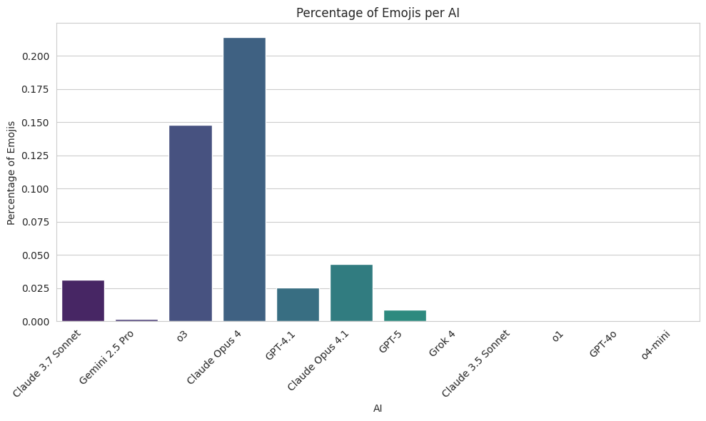 Next we looked at emojis: Some models use them and others really do not. There doesn’t seem to be a clear pattern.
