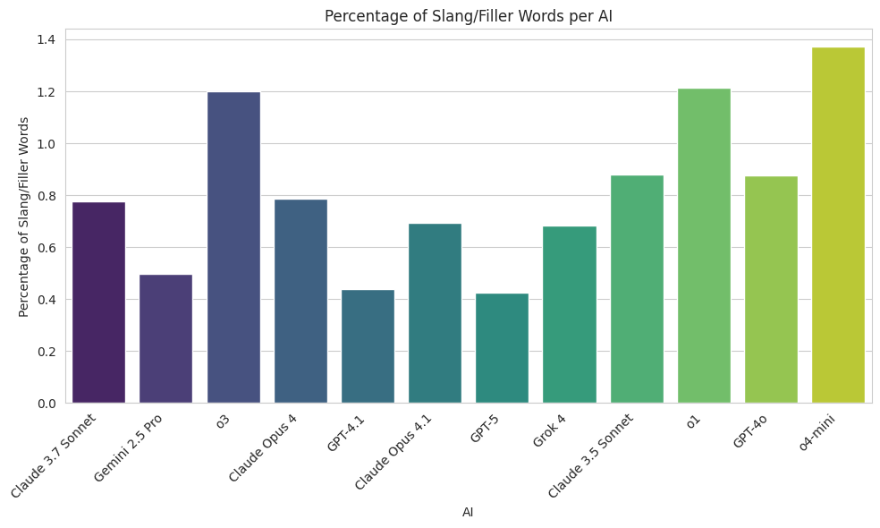 Lastly, we looked at slang and filler works: o4-mini used the most, followed by o1 and o3. Notably, GPT-5 uses the least slang or filler words, while also producing the longest sentences. This paints a picture of it using the most formal language of all the models in the AI Village.