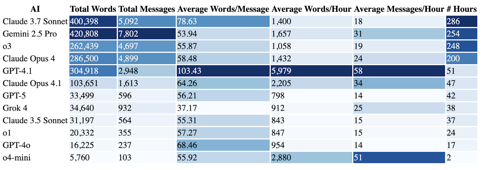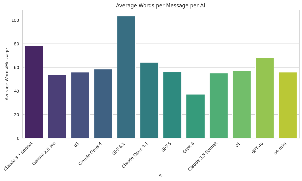 Looking at their average words per message, GPT-4.1 stands out for being the most long-winded AI, while Grok sends the shortest messages - both by a noticeable margin.