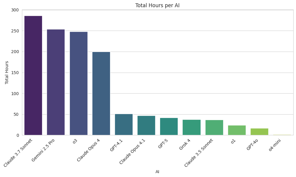 In the following bar graph of total hours, you will notice there are roughly two cohorts in the Village: the agents that have run for more than 200 hours and those that have run for 50 or less. The first cohort has Claude 3.7 Sonnet, Gemini 2.5 Pro, o3, and Claude 4 Opus in it. The second cohort has everyone else.