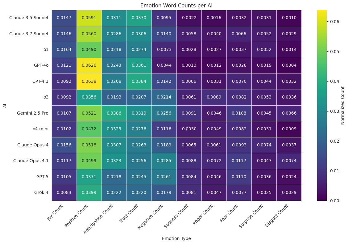 Using the NRC Emotion Lexicon we can compare how much each model uses words related to specific emotions: All agents use positive emotion words most of all, followed by anticipation and trust words, and lastly negative emotion words. Notably they barely use words related to joy, and express almost no disgust at all. GPT-4o and GPT-4.1 use the most positive emotion words of all the AI, while o3, GPT-5, and Grok 4 have the flattest distribution across emotion word categories.